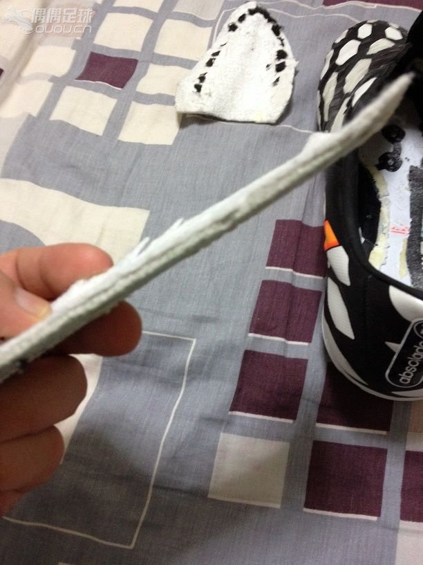 今天决定用一只先试一下,保留另一只原样,以便日后感受差异。先是暴力撕掉中底后半部分,很顺利。但前半部分尤其是接近鞋头位置,异常困难,粘贴实在牢固。动用了美工刀,在鞋腔里试图划断粘连部位,不慎却割破了大底TPU长达2厘米,哭啊!好在是在鞋头部位,后面打算试试有没有胶水能重新粘牢豁口(感觉希望不大)。下图中,被我中途剪断的中底,前半部分背面有黑点的地方,就是与大底粘贴非常牢固的地方。第二张图中,可见中底确实是两层,其中一层很软,完全覆盖大底。另一层类似半底,硬而坚固,美工刀划的时候有白色粉末掉下来。