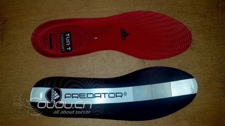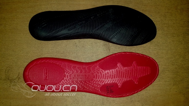 大家可以看到:F50红色鞋垫有明显的缓震区域,猎鹰10的鞋垫是一整块PU垫。