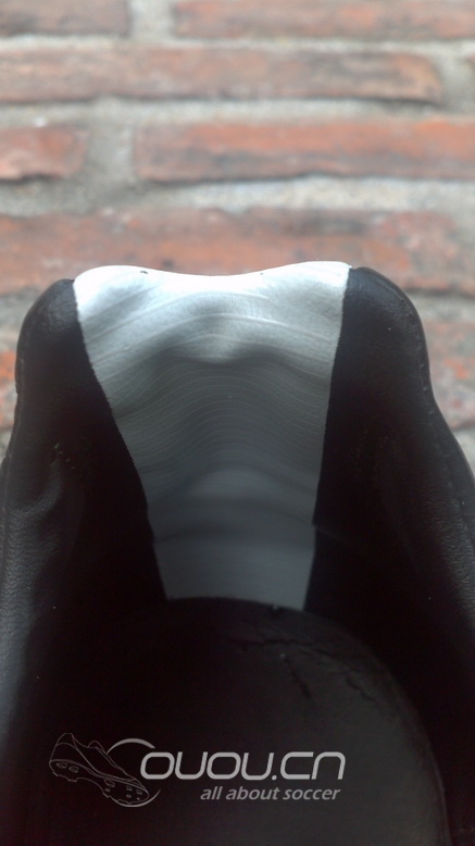 去除鞋垫后的部分,该部分在穿着时,会发现后脚跟有明显的弹性,个人爱好在实战时将脚跟压入该部分区域内,所以在去除鞋垫后可以看到该部分区域有些许内凹。