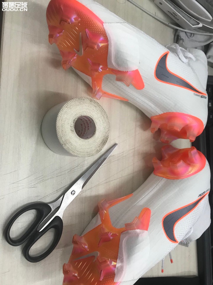 因为看过以前有球员用绷带缠住鞋带和球鞋中部一圈来防治鞋带影响触球得到了启发,反正绷带也不贵,幸运的是耐克JDI鞋面是白色的,贴上丝毫不影响颜值