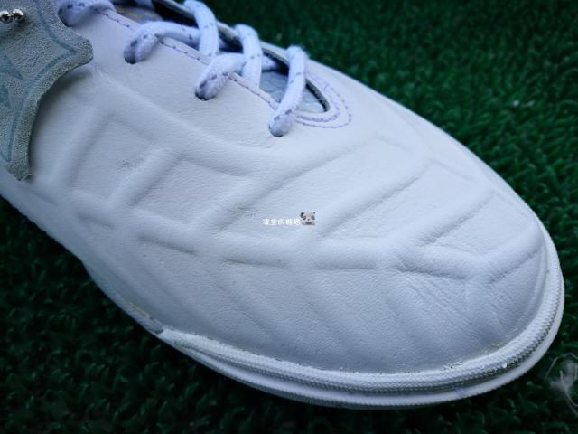 在通常的印象中,牛皮材质的鞋面是中端AS(TF)战靴的标配,至于袋鼠皮嘛,那是高端款才能拥有的配置。不过Mizuno Rebula V2 AS的出现打破了人们的固有思维,鞋头主要触球部位采用袋鼠皮制作,而且面积真的不算小。用于大场高端款Rebula V1鞋面上的CT Frame科技同样应用于这款中端AS战靴上,通过在真皮鞋面下方置入慢弹海绵骨架来提升双脚在触球时对足球的感知,并且让鞋面拥有更好的支撑表现。除主要触球部位鞋面使用了袋鼠皮打造外,Rebula V2 AS鞋身大部分区域都采用了触感良好的牛皮材料制作,仅仅在后跟银色部分使用了人造超纤材料。这样的鞋面配置对于一款AS(TF)战靴来说真的是相当豪华。