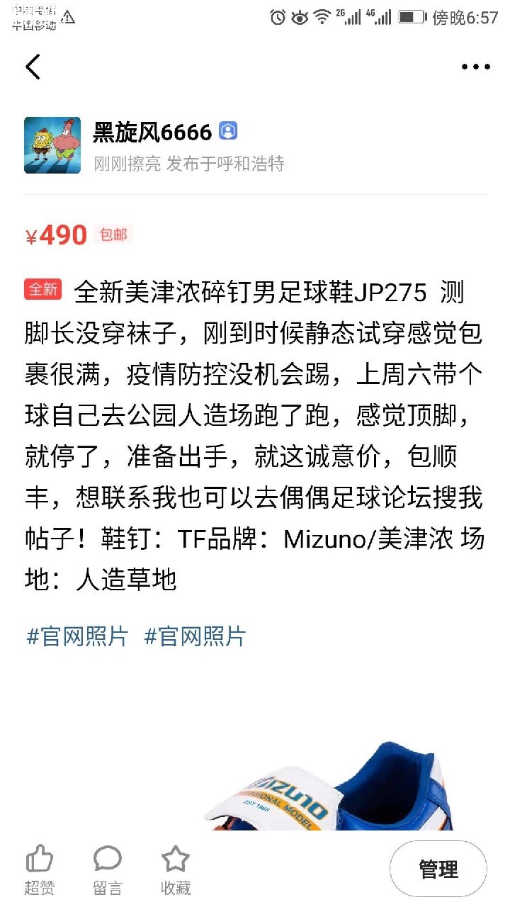 2月底刚入手美津浓MORELIA碎钉,买小了,测脚长没穿袜子。疫情防控没踢过,但是上周六自己穿鞋拿着足球去公园人造场地踢了几分钟,感觉顶脚就停了,全新,JP275,490,包邮,可咸鱼交易