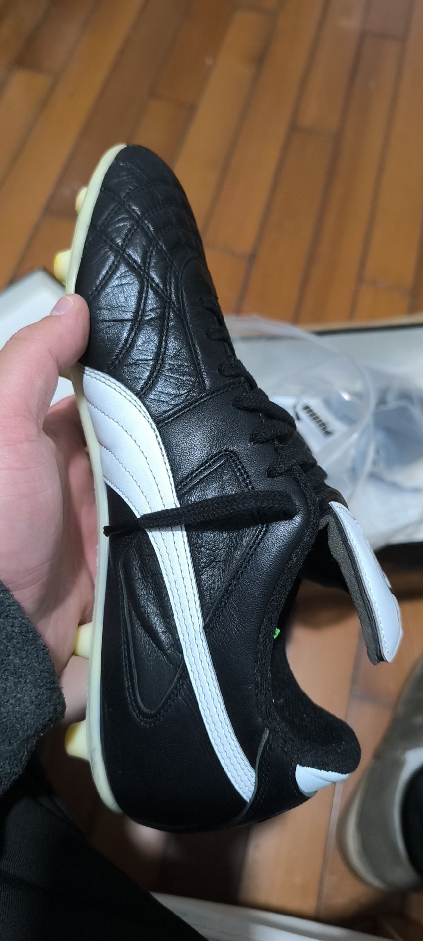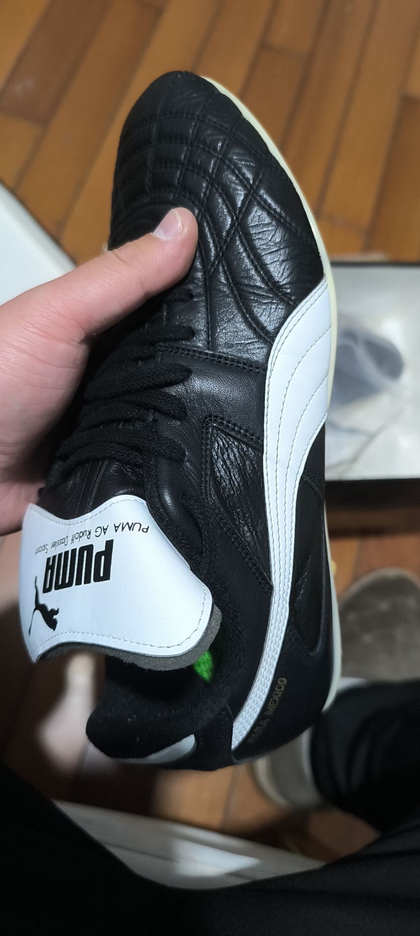 记得穿鞋的时候不要拉扯Puma Rudolf Dassler这块人造材料,我的已经被拉的起皱了,人造材料没办法,老化不可避免...还有保存的时候放点干燥剂,据说可以防止PU变粘