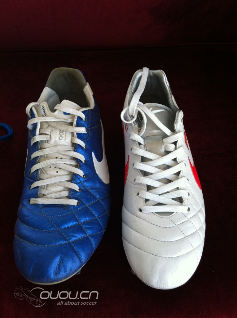 和顶级蓝色FG比较。因为蓝色实战了三场,已经被我撑宽了一点,后跟处ELITE较平,而ACC比较圆润。可能是和飞线技术有关。因为后跟摸着里面像有块硬片。鞋垫都是蓝黑色的没区别。触感来说,ELITE前部相对感觉较饱满,而ACC可能是部分合成袋鼠皮原因,皮感稍差